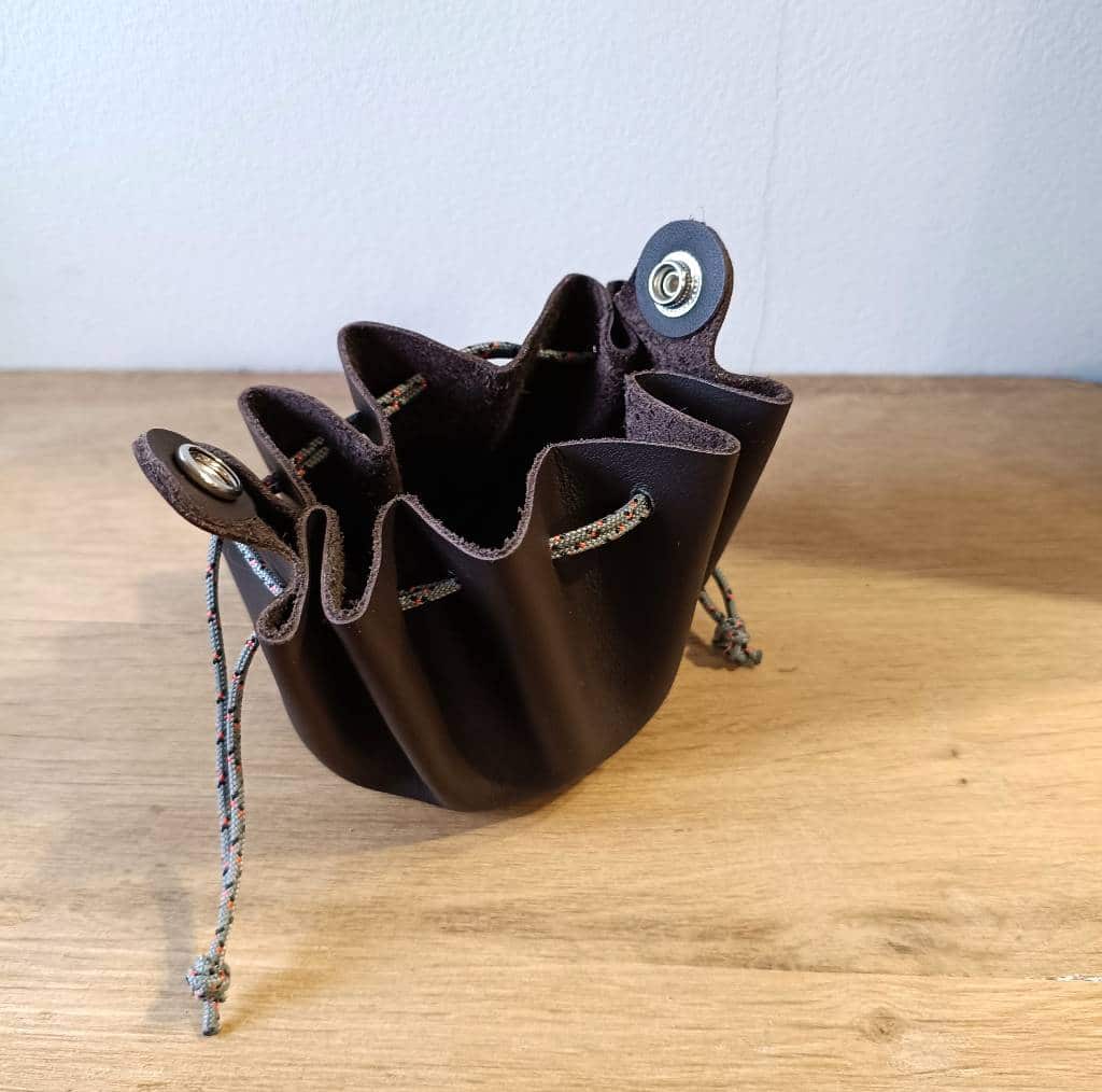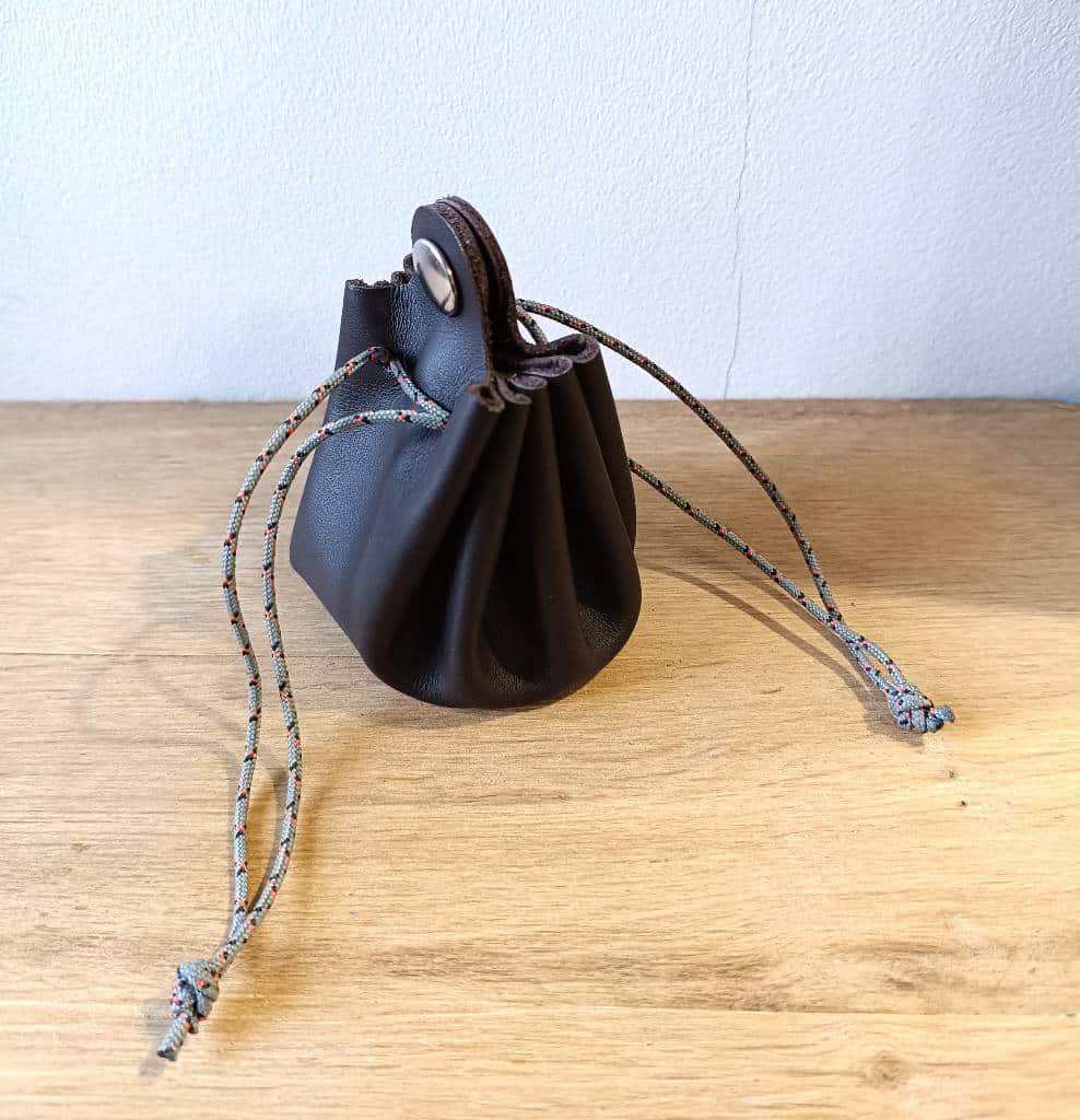Bourse porte-monnaie en cuir marron et cordelette grise
